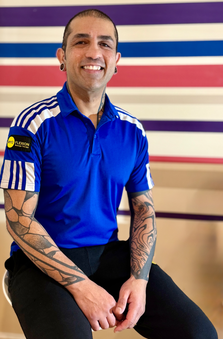At the core of Myo Flexion is Devinder “Jolly” Matharu — a name you’ll hear often, and a face you’ll quickly come to trust. Jolly isn’t just a fully qualified and insured sports massage therapist — he’s a proud member of the Federation of Holistic Therapists (FHT) and someone who genuinely lives and breathes the craft. He earned his VTCT Levels 3, 4, and 5 under the expert guidance of Clare Riddell, Director of Pressure Point, and continues to stay at the forefront of new techniques and best practices.